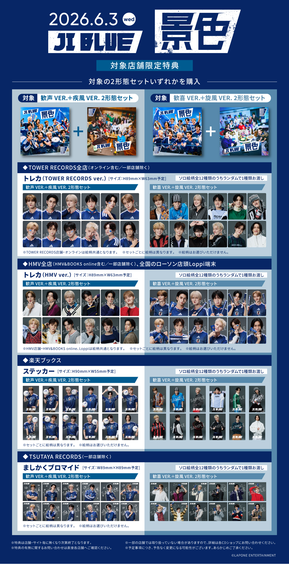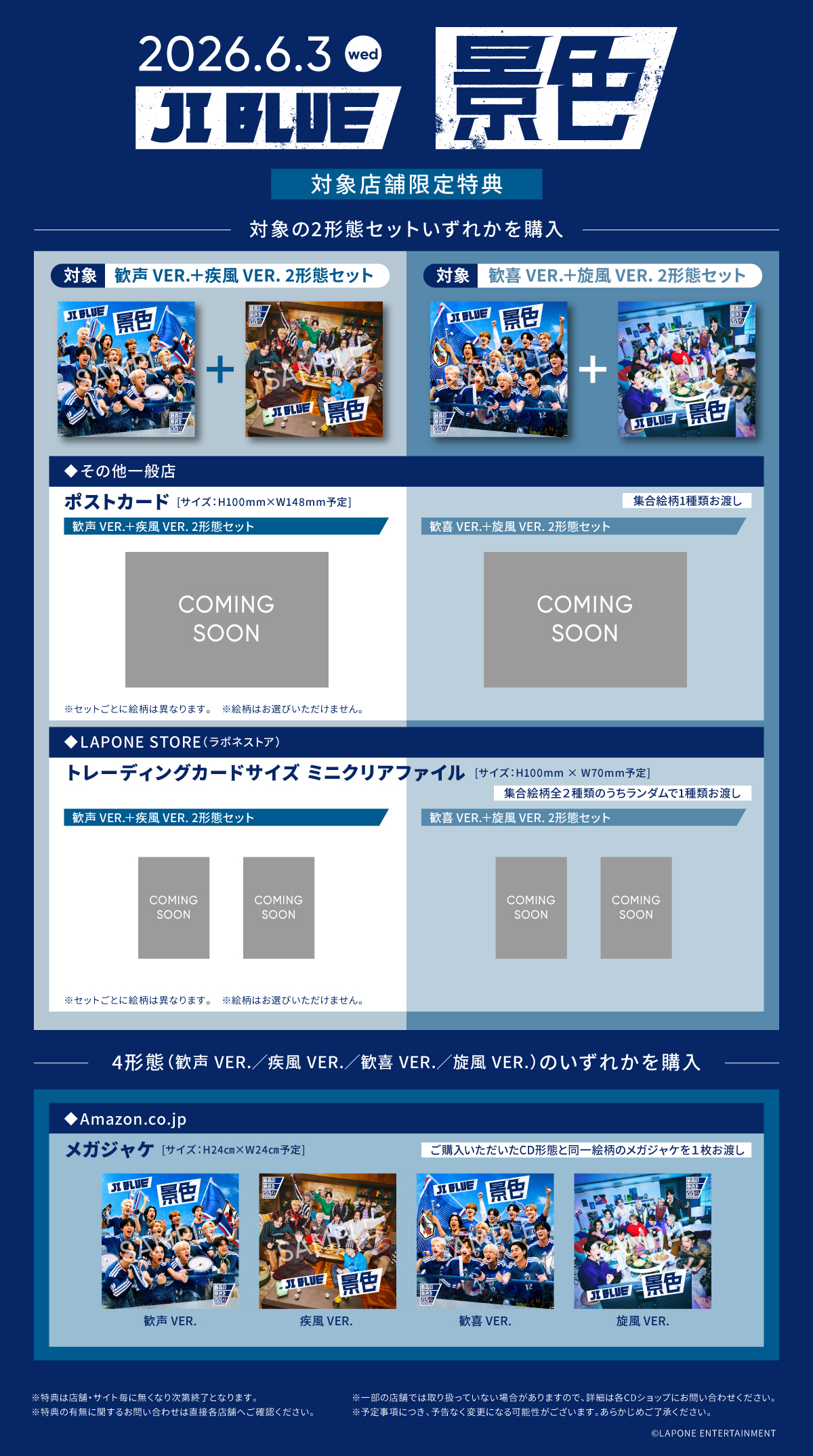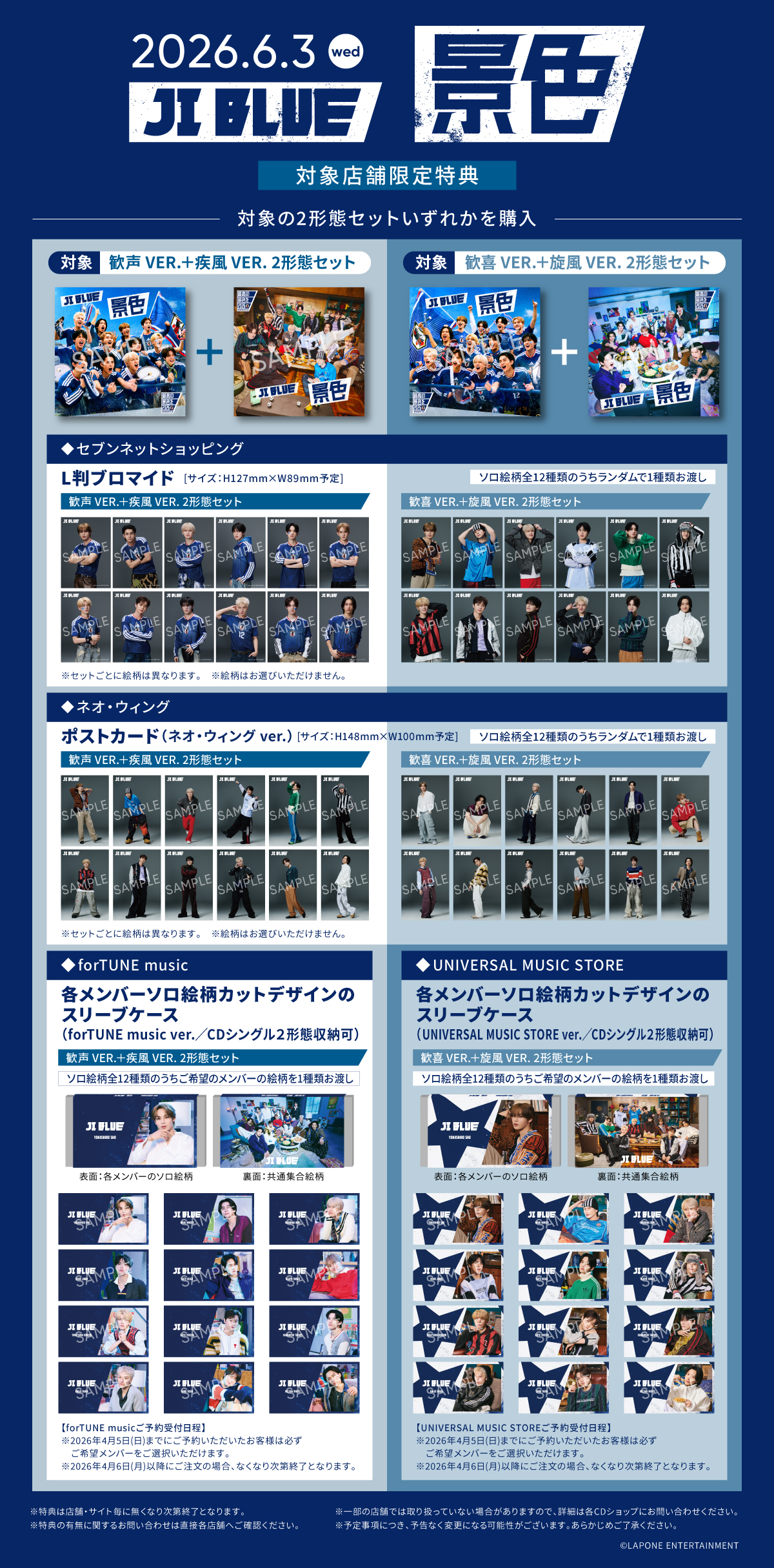 2026年6月3日(水)発売 JI BLUE SINGLE『景色』(歓声 VER./疾風 VER./歓喜 VER./旋風 VER.)を対象店舗にてご予約(ご購入)いただくと、下記の先着特典をプレゼントいたします。いずれの特典もなくなり次第終了となりますので、お早めにご予約ください。